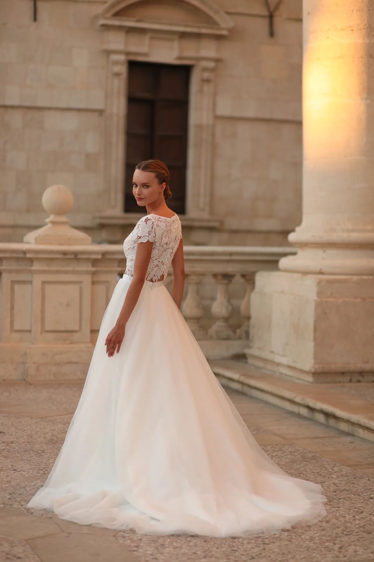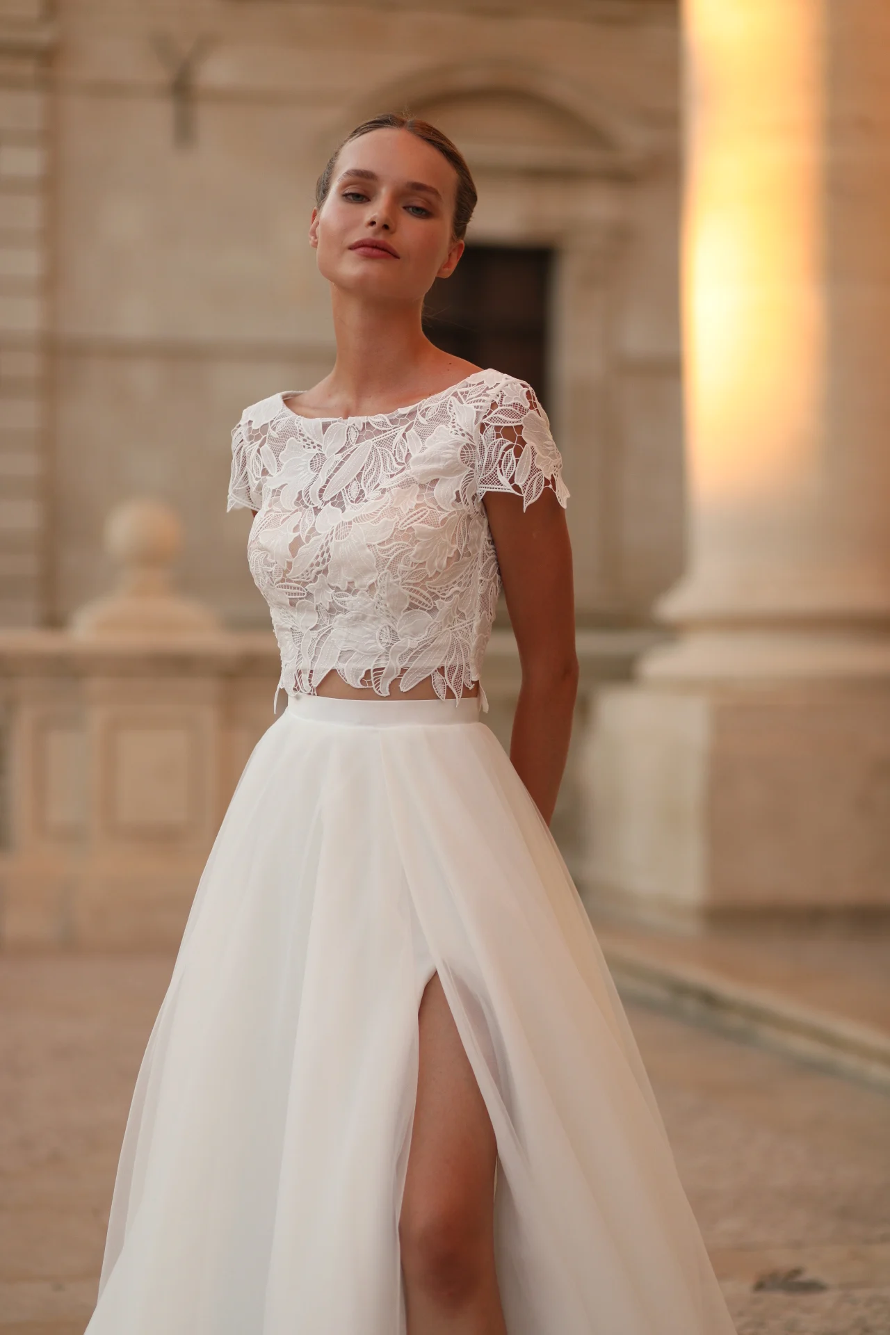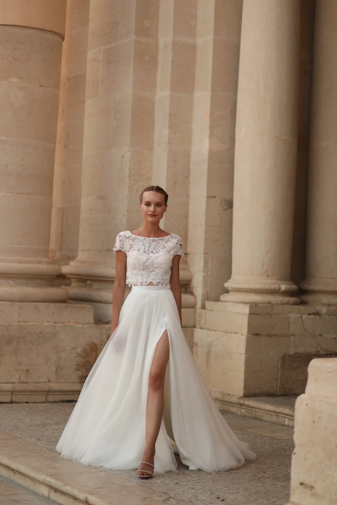 Un diseño original que combina sofisticación y frescura. La parte superior, confeccionada en encaje y seda, presenta mangas cortas y un delicado cuello bote, aportando elegancia y feminidad.