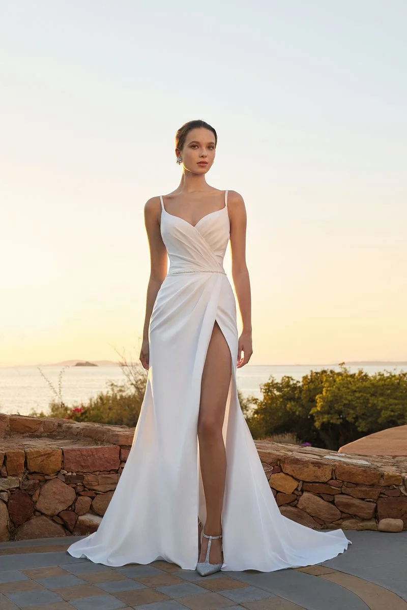 Los finos tirantes aportan delicadeza, mientras la abertura frontal añade un detalle impactante y moderno que realza cada paso. Ideal para la novia que busca un look sencillo, contemporáneo y lleno de personalidad, sin perder un ápice de elegancia.